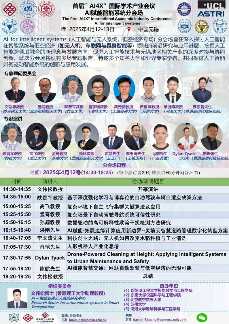 - Co-Chair, The First “Al4X” International Academic Industry Conference Plenary Session: Al for Intelligent Systems, Wuxi, China, 2025 (Poster)