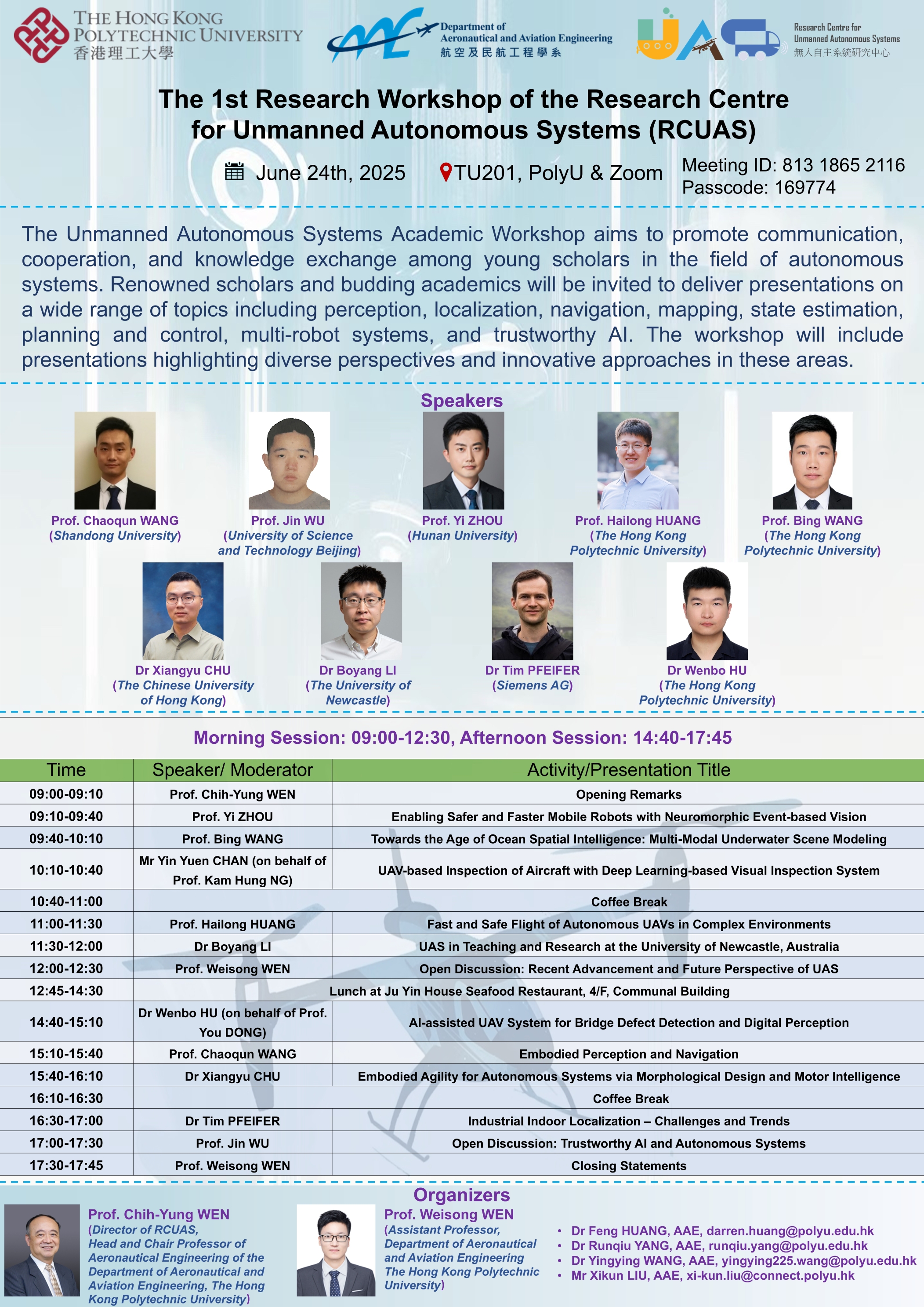 - Co-Chair, The 1st Research Workshop of the Research Centre for Unmanned Autonomous Systems (RCUAS), Hong Kong SAR, 2025 (Poster)